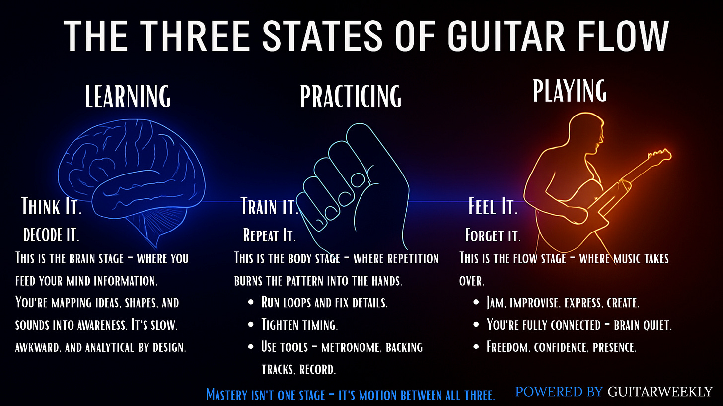 How guitarists move from thinking → training → pure flow.