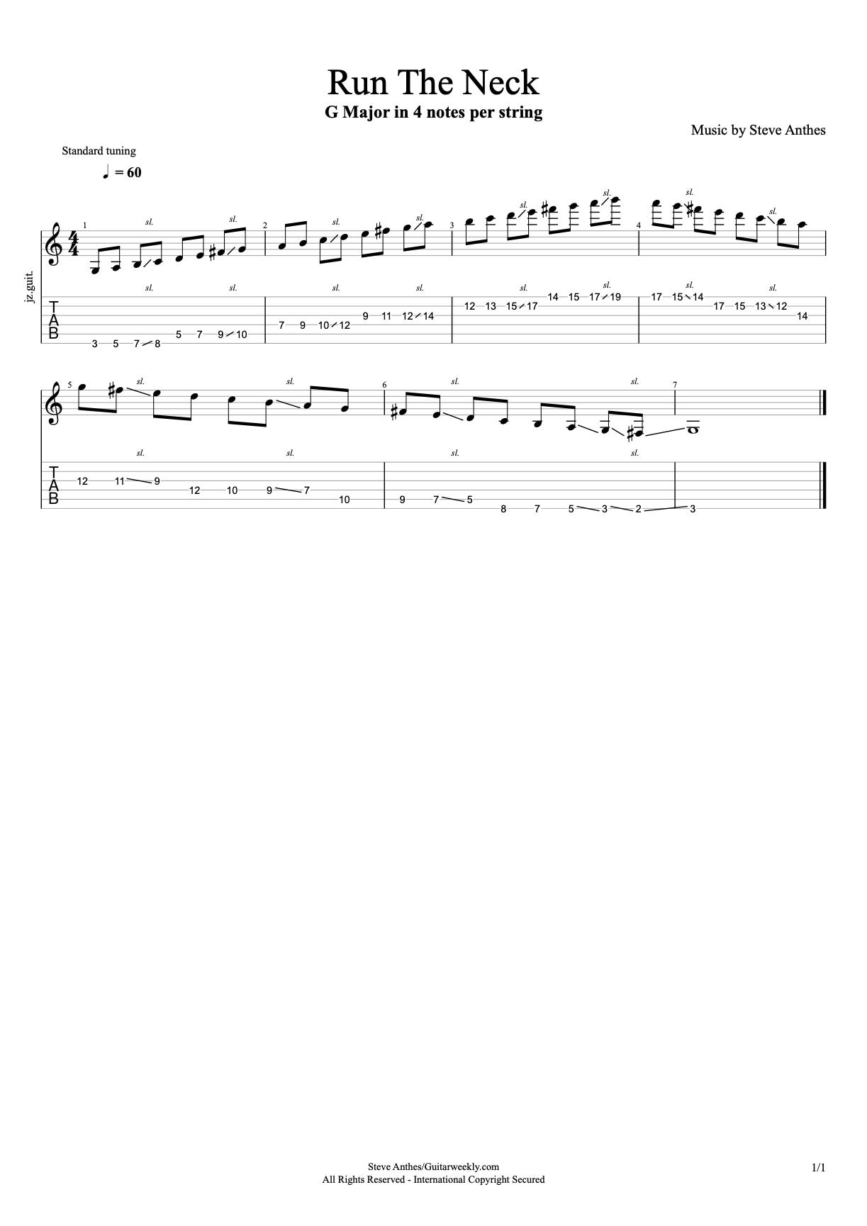 Learning the G major scale as a four-notes-per-string pattern is one of the fastest ways to build real fretboard command. Instead of memorizing scattered shapes, you’re training your hands and brain to see the neck as one continuous highway. The wide stretches force you to develop clean finger placement and efficient motion — and the signature third-to-fourth-note pinky slide trains you to shift smoothly without breaking the line. You’re not just learning a scale; you’re learning how to move.